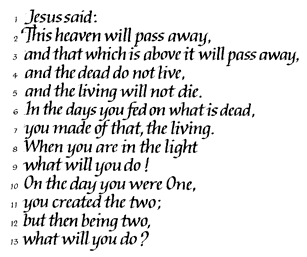 To be worthy means to be at the level of initiation which enables what Jesus says to us to be interpreted. During the initiation there is given to us, by successive revelations, both knowledge of ourselves and knowledge of the Father: When you Know your selves, then you will be Known (log. 3.9-10). In the Thomas Gospel, knowledge of the Father is obtained by us through the Son. It is the Son who introduces us into the kingdom of the Father, who reveals to us that which is hidden (log. 108). He reveals it to us in his words, but only if we do not cease from seeking (log. 2), or in other words, if we drink from his mouth (log. 108). Osmosis leads to identifying. There is no longer either subject or object. The mind has fallen silent. In the words of the east, the Self has laid siege to the Ego. This path, which demands the liberation of the Ego, is distressing, even suicidal: and very few are they who agree to pay the price: I found them all drunk (log. 28.4).