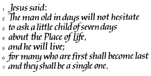 Here we are again invited to effect the reversion to the original state, to the primordial androgynous being of which the little child offers us the most adequate possible image. .......... We cannot revert to the One - and they will be One - without transcending duality. This repeated invitation to “make the two One” (logia 11, 22, 30, 106) is here underlined by the figure seven. The symbolism of numbers is a science to be used with discrimination; however we can, in accord with the ancients, see in the number seven the symbol of human totality, at once male and female. The child of seven days is thus doubly qualified to show us the place of Life, which is also the place of the Light, the place where Jesus abides (log. 24) and which his disciples ask to know about.