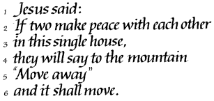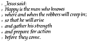 We find here the invitation to vigilance which we encountered in logion 21. We learn little by little to identify the robbers and plunderers. The Ego, in order to assert itself as a separate entity, needs to appear different, to build itself up with what it appropriates to itself. It persists in the idea that it is distinct and dedicates all its resources to cultivate that in which it differs from others. Becoming aware of what is, brings about the destruction of illusion. And as the Ego is built upon illusion, it must disappear. This is work which demands patience, attention and prudence, because in order to construct itself it has usurped all the mind’s resources. Happy the man who can spot the usurper, can distance himself from it and be sufficiently vigilant to outwit the adversary before it gets into his dwelling. Little by little, he will succeed in putting aside the apparition which made him think that he was not the Self.