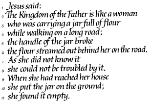 The adventure which happens to the woman in this logion is somewhat baffling at first sight. How could she not have noticed, having travelled a long road, that the handle of her jar had broken, that the flour had all spilled out behind her on the road? The handle could not have broken without being knocked - perhaps by a branch in passing - and the difference in weight between a full jar and an empty jar ought to have caught her attention even if the flour spilled out very gradually. The circumstances are obviously perplexing. And what is even more surprising, for the outside observer, is that Jesus is comparing the Kingdom of the Father to this woman. The situation is the opposite of the preceding logion, where the woman was investing with importance a food indispensable to life. Nevertheless, in investing things with importance, we run a strong risk of investing ourselves with importance, of expecting, of desiring, even of courting compliments for those large loaves which will bring happiness to man … Here, it is quite the opposite: reproaches to be expected, explanations to be given, suspicions to be appeased, loss to be remedied…