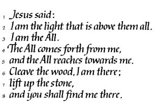 Having declared that he is the Light, Jesus affirms that he is the All: I am the All. The All comes forth from me, and the All reaches towards me . And then, he underlines his omnipresence: Cleave the wood, I am there; lift up the stone, and you shall find me there.